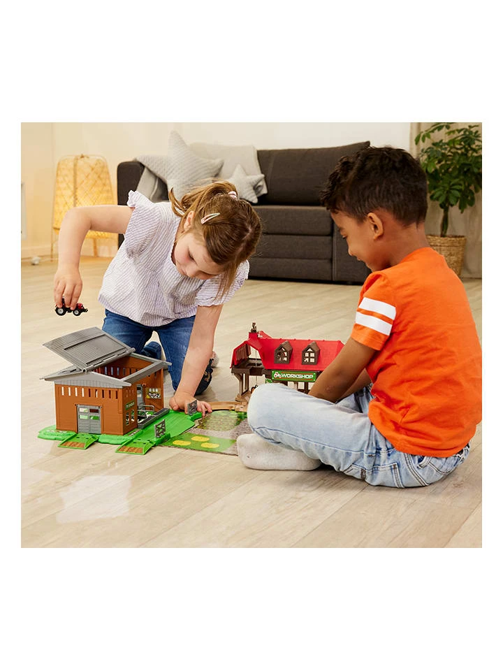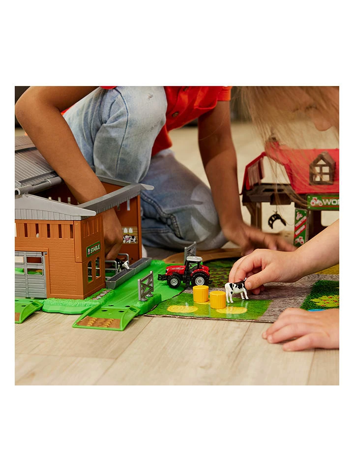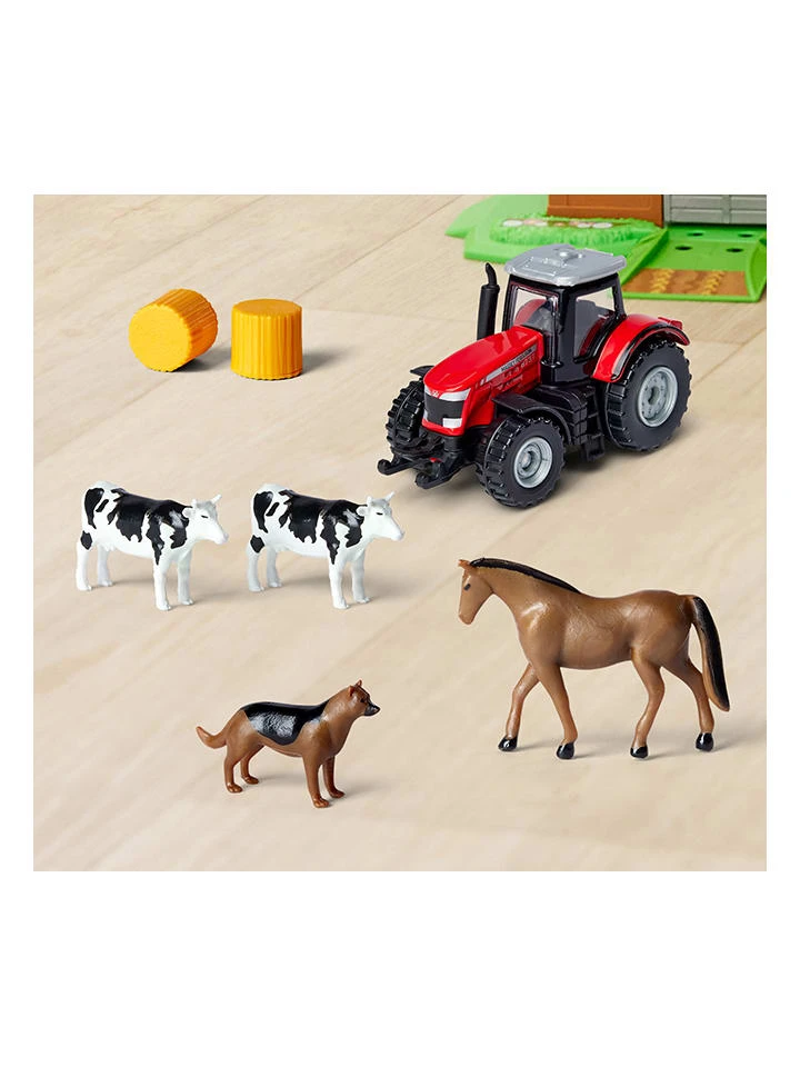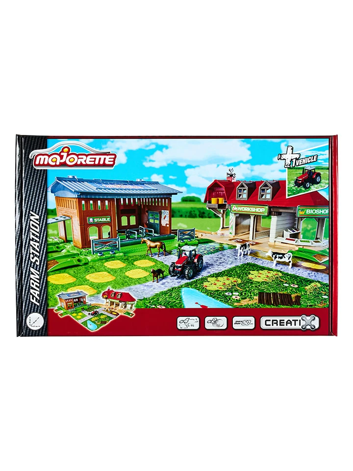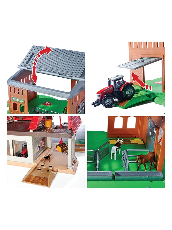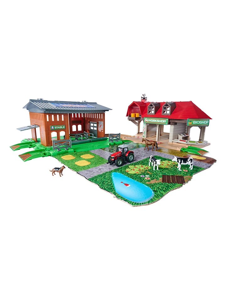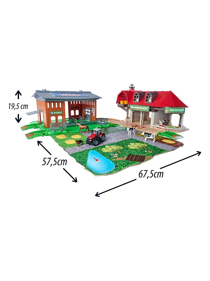 – Inhalt; 1 Farm-Station mit Stall, 1 Bioladen, 1 Traktor-Reparatur-Stationm 1 Traktor (Massey Ferguson 8700 im Maßstab 1:64), 2x Kuh, 2x Heuballen, 1x Schäferhund, 1x Pferd