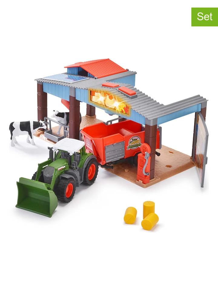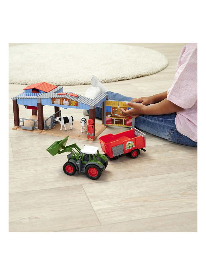 – Inhalt: aufklappbarer Bauernhof, Traktor mit Anhänger, 2 Kühe, 3 Heuballen & 1 Kuhwaschanlage