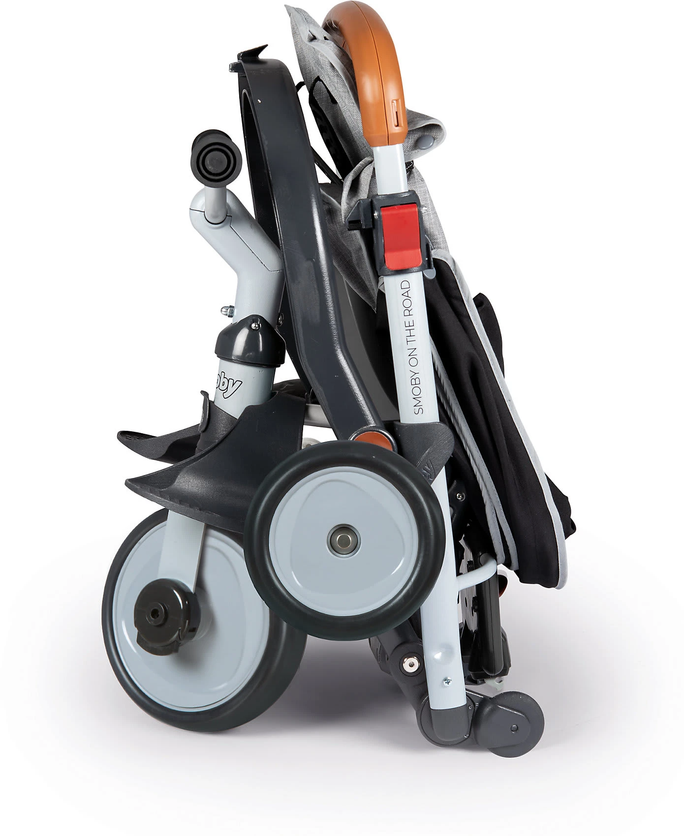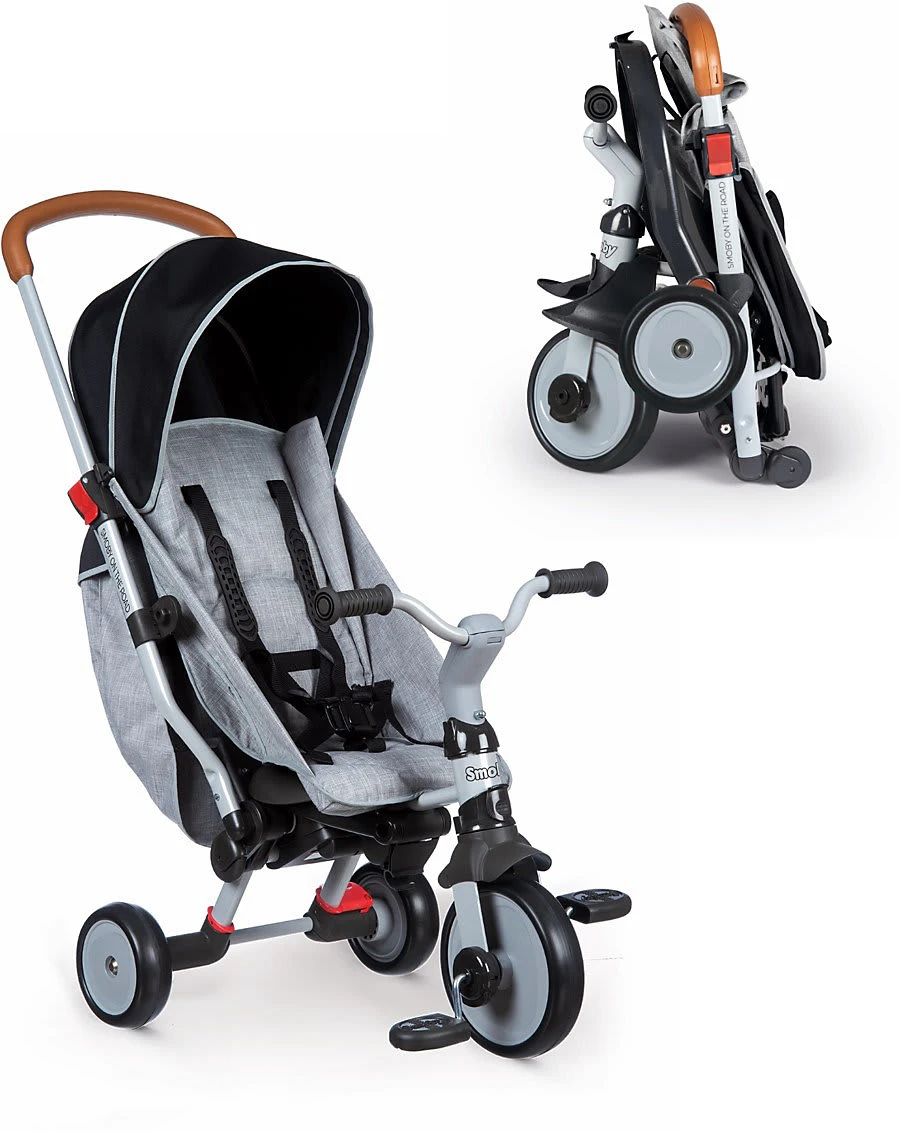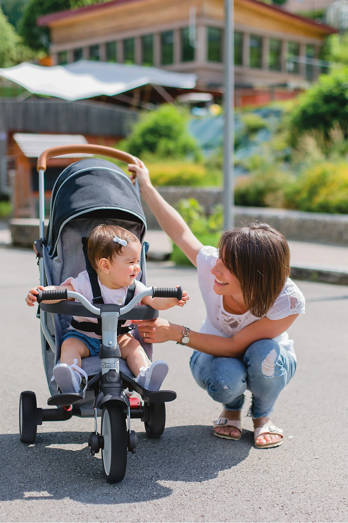 Dieses mitwachsende und einfach faltbare Dreirad „Robin“ aus dem Hause Smoby ist ein lange währender Begleiter im Alltag mit Kind. Per Knopfdruck ist es mit nur wenigen Handgriffen zusammenklappbar und lässt sich durch die innovative Lenkfunktion ebenfalls per Knopfdruck einfach von den Eltern steuern. Für Sicherheit und Komfort sorgen der 3-Punkt-Sicherheitsgurt, der Sicherheitsring sowie das bequeme Textilpolster. Auch bei der zusätzlichen Ausstattung punktet das Dreirad: Mit dabei sind neben den abnehmbaren Fußstützen und der Feststellbremse auch ein zuschaltbarer Pedalfreilauf, eine Lenkeinschränkung und eine große Tasche beispielsweise für Einkäufe. Sobald das Kind groß genug ist, kann die Lenkstange abgenommen werden, damit es eigenständig fährt.
